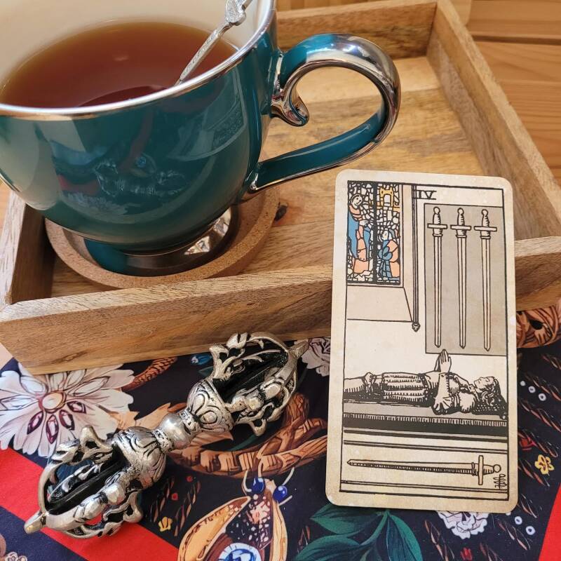Ik voelde me letterlijk als de persoon op de vier van zwaarden, die ook wel gelinkt wordt aan Christian Rosenkreutz, de oprichter van de Rozenkruisers.