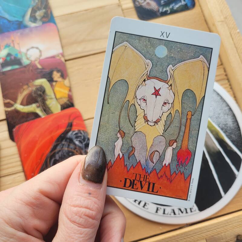 Ik trok vanuit het Lichtzieners tarot van Chris Anne mijn maandkaarten en themakaarten. Ik haalde de Duivel uit mijn Aquarian Tarot, en als orakeldeck het Archetypes deck van Kim Krans.