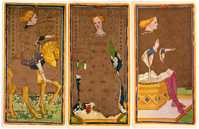 Vanuit de Mamluk werd de hofhouding overgenomen en aangepast naar Italiaanse begrippen, en werd de hofhouding in een Tarocchi deck samengesteld uit de schildknaap, de ridder, de koningin en de koning. In de Visconti Sforza zitten ook extra kaarten; de jongedame en de dame op het paard.